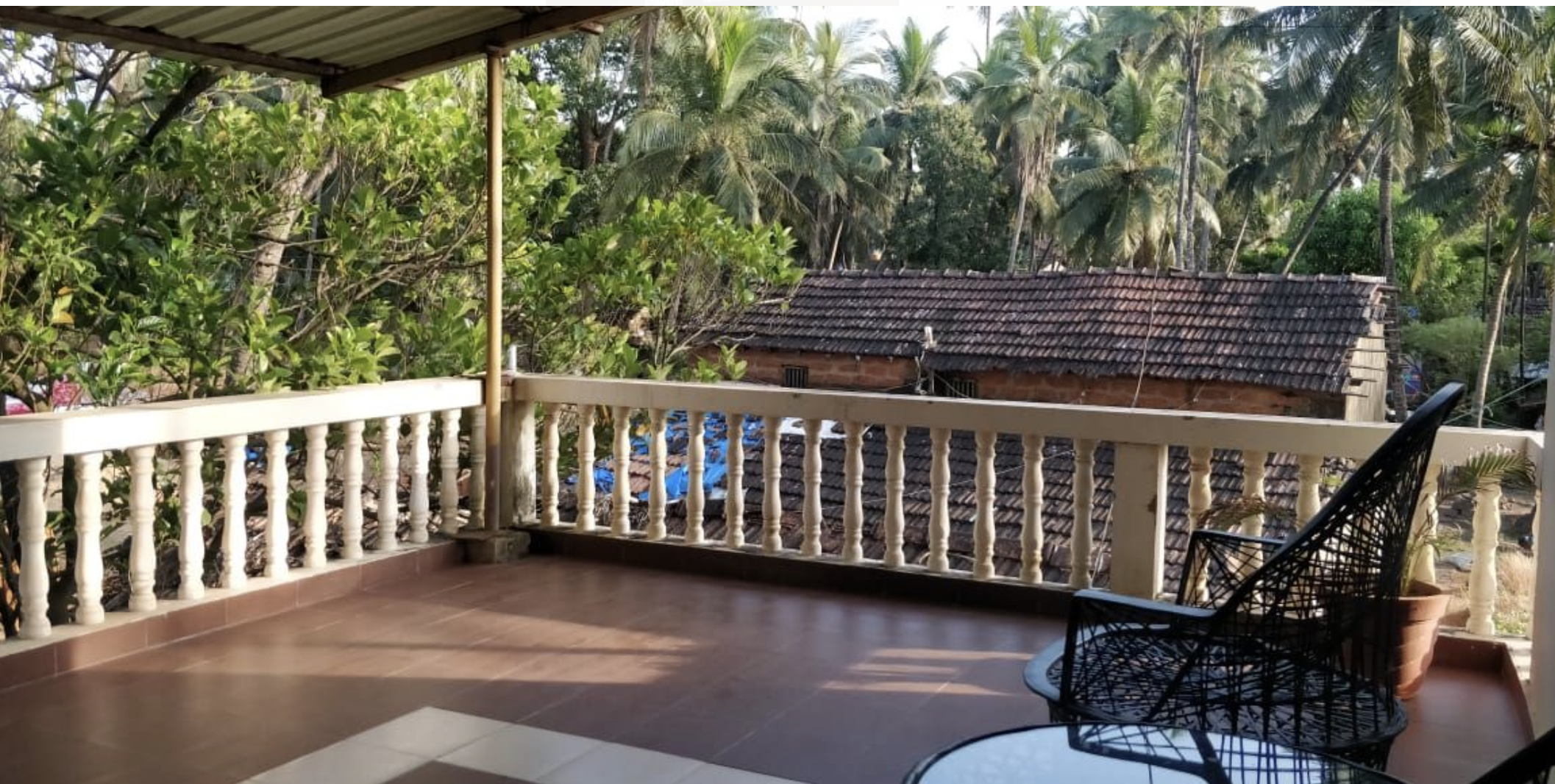 Spanning 250 sq. ft., the Queen Suite AC (Village Facing) features a solid concrete ceiling, unlike our other rooms with traditional terracotta-tiled roofing. It offers access to a common balcony with serene coastal village views. The room is well-ventilated, with a window opening toward the balcony, and comes equipped with air conditioning, an LCD TV, an electric kettle, towels, basic toiletries, and a private attached bathroom with a western-style toilet and hairdryer.